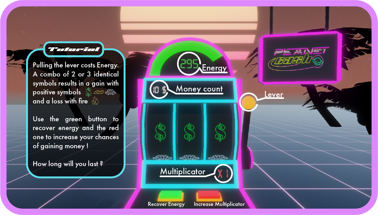 Planet Cash is an incremental slot machine game in which you must use the planet's energy to pull the lever. Be careful: if the energy drops to zero, it's game over (and incidentally, the end of the world).